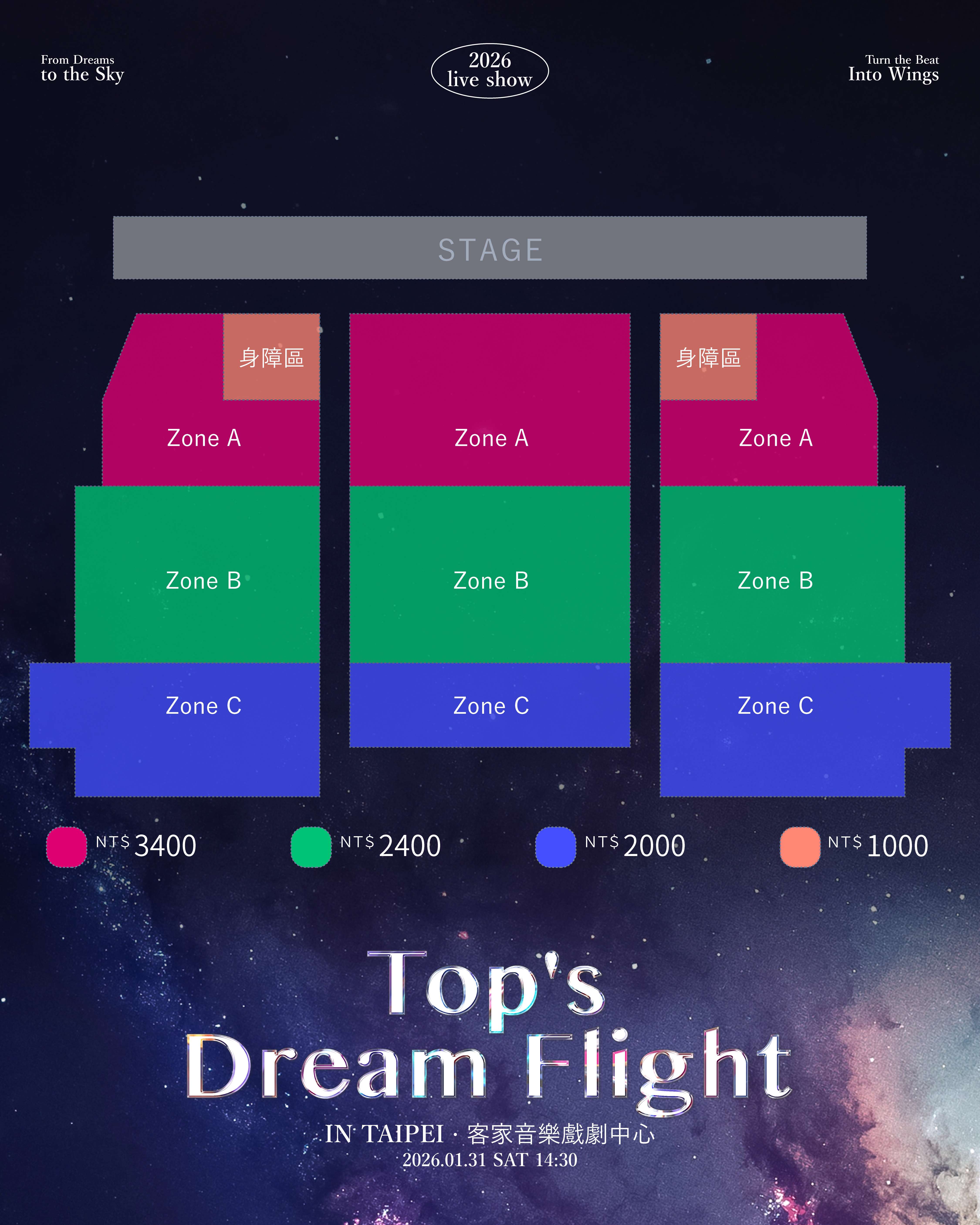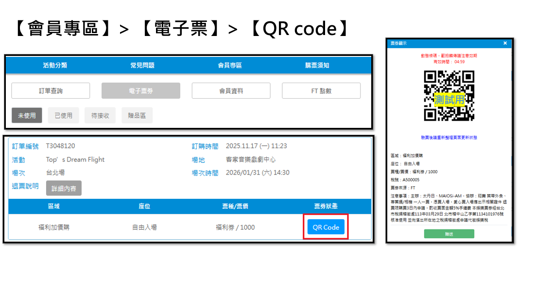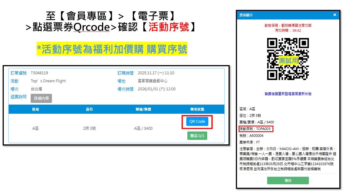 4.購票請選擇【電子票】,購票時選擇【自行選位】請依照座位圖下方訂購座位明細顯示之座位號碼為主,並於購買前確認座位後再執行付款。5.付款完成之訂單,逾期未取票者視同售出,恕不接受退票或退費。