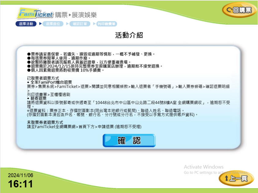 購買日起三天內可退票並酌收10%手續費,第四日起將無法退票。