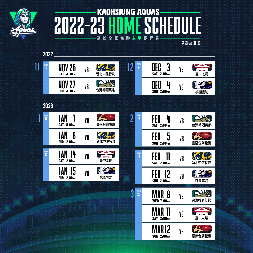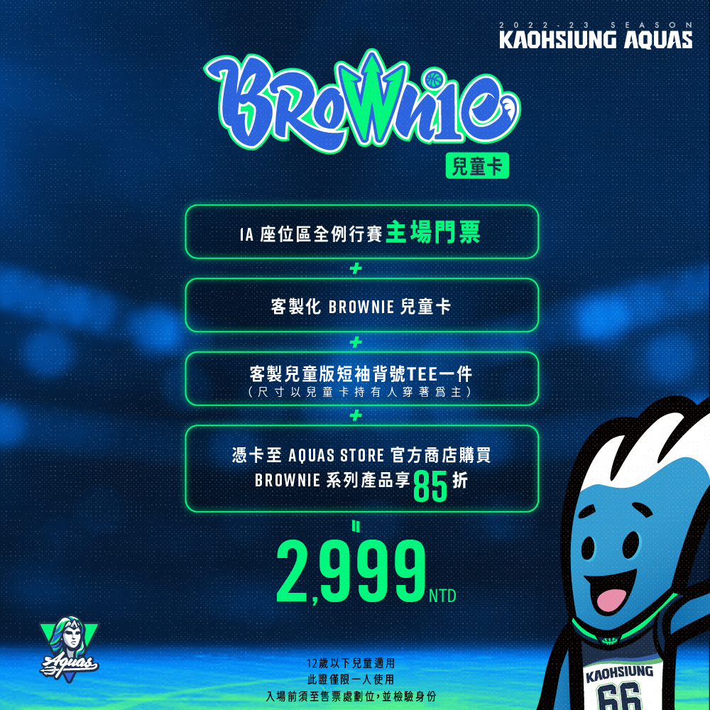 3.適用期間:BROWNIE兒童卡權益適用期間為 2022-2023 T1 League賽季期間高雄全家海神主場例行賽,共計15場比賽,詳細賽程請參考下圖公告。