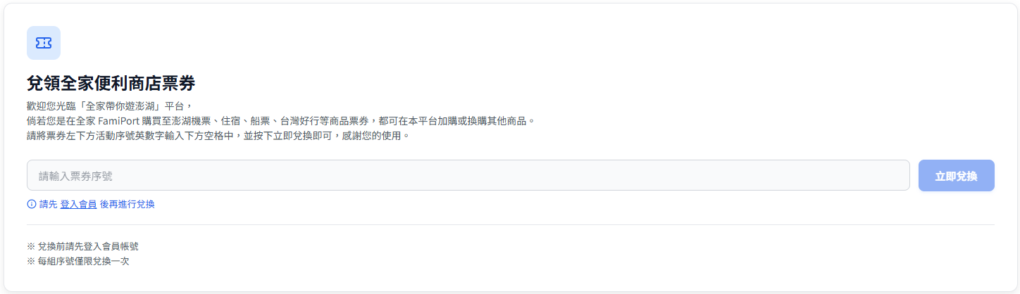 ◆ 歡迎您光臨「全家帶你遊澎湖」平台,倘若您是在全家 FamiPort 購買至澎湖機票、住宿、船票、台灣好行等商品票券,都可在本平台加購或換購其他商品。