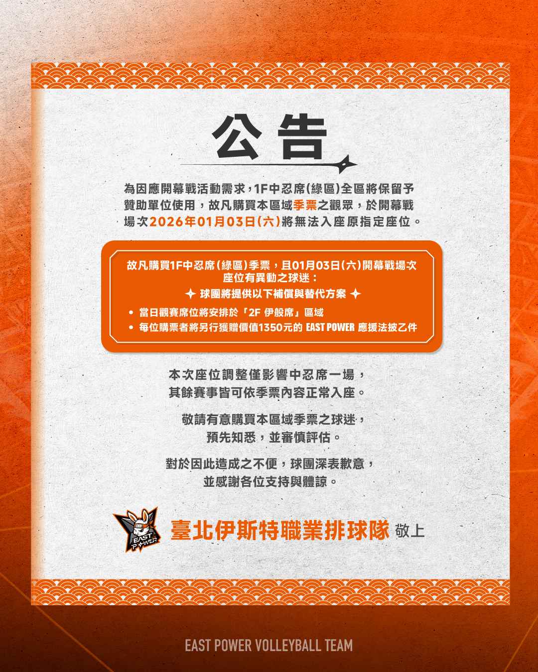 6.1.6. 若因場館現場設備調整導致座位更動,臺北伊斯特職業排球隊保留更換座位的權利。