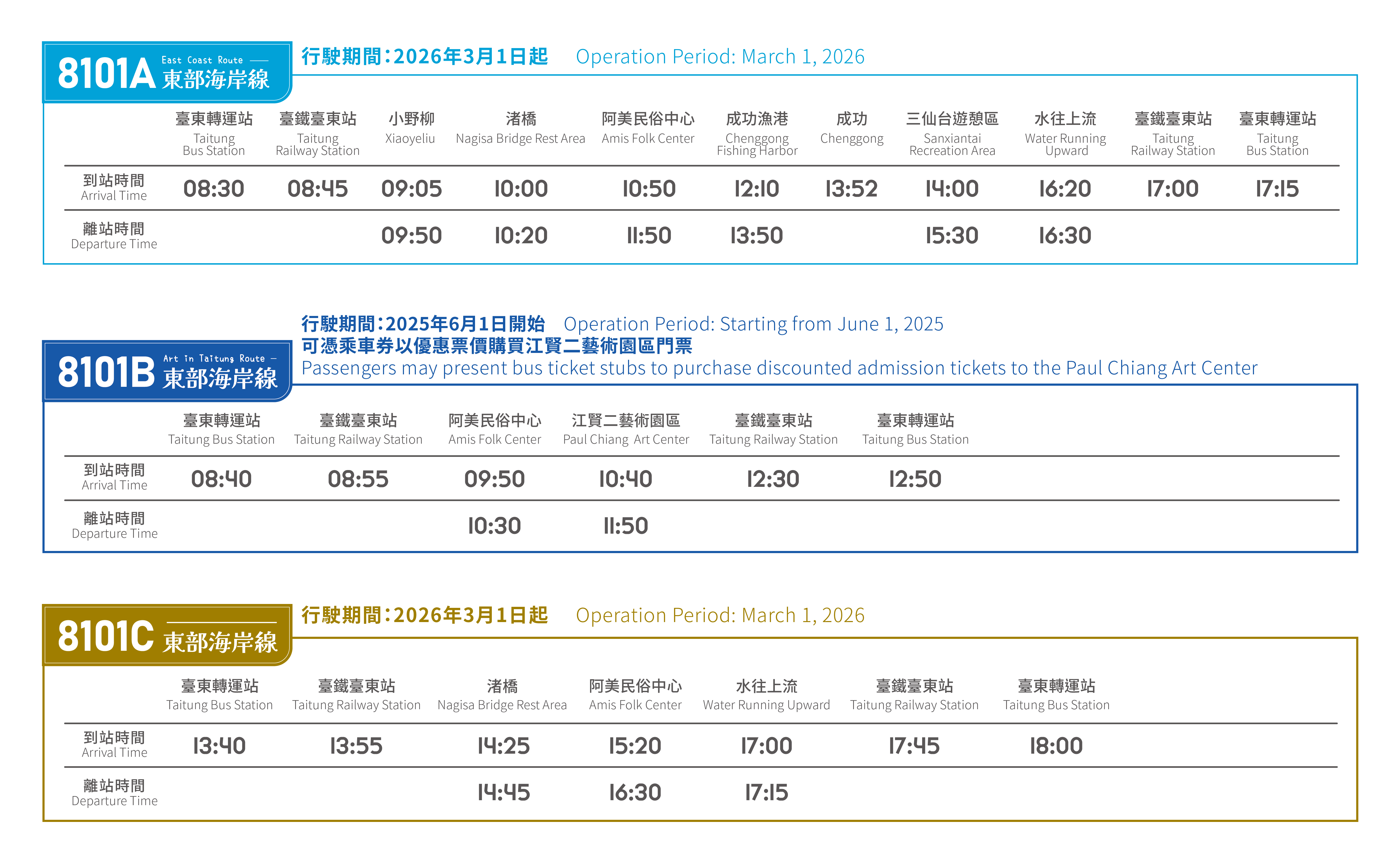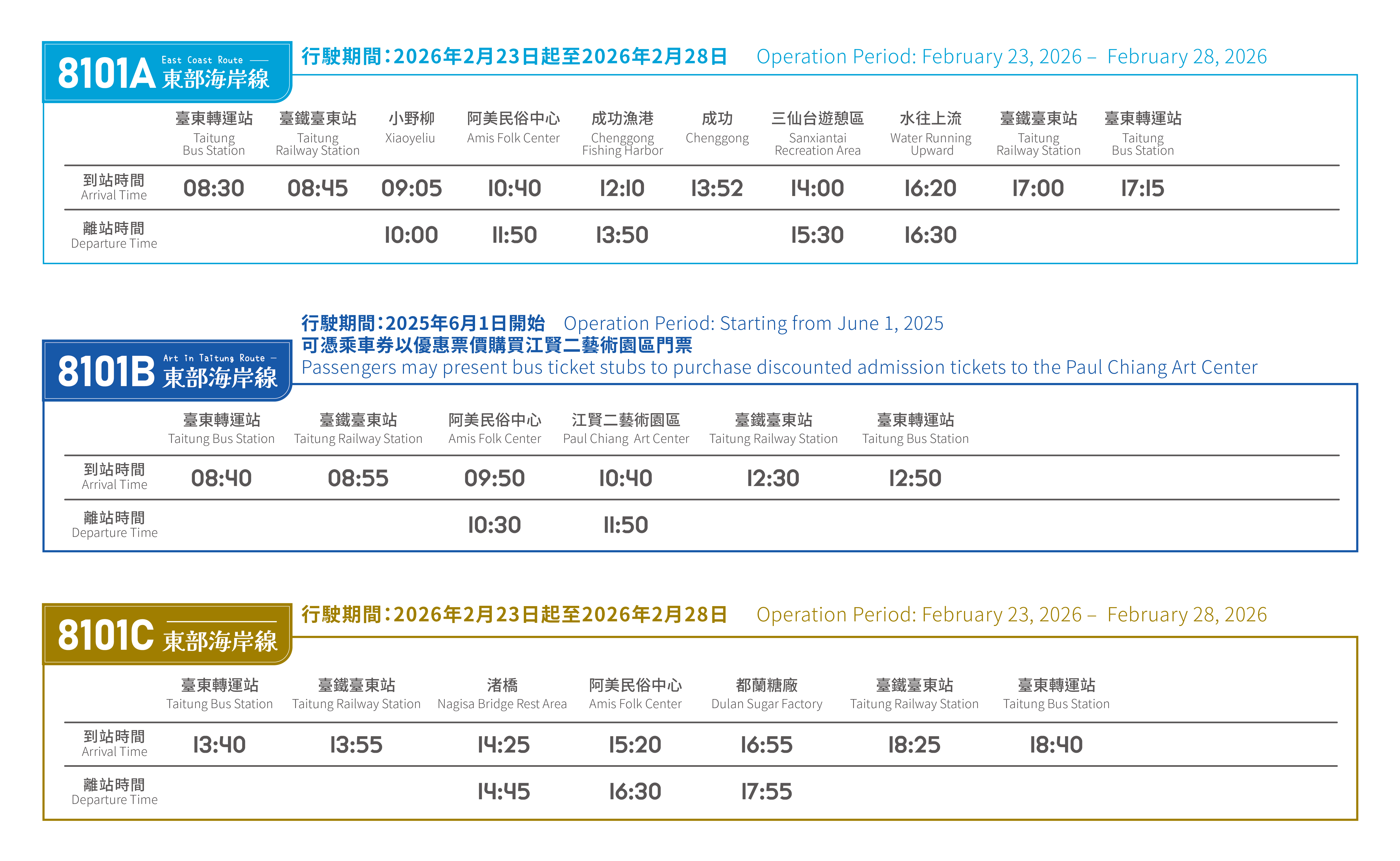 8101C路線自臺東火車站與臺東轉運站出發,沿著海岸公路一路北行,串連渚橋、阿美民俗中心與水往上流等經典景點。旅途中,導覽老師將陪伴旅客細細品味東部的文化底蘊——從渚橋的風景,到阿美民俗中心的原住民族舞蹈表演與文化展示,再到都蘭糖廠的文創聚落與咖啡香氣,每一站都充滿故事與驚喜。(請依時刻表搭乘或於官網看最新時刻表> https://tts.sdbus.tw/)